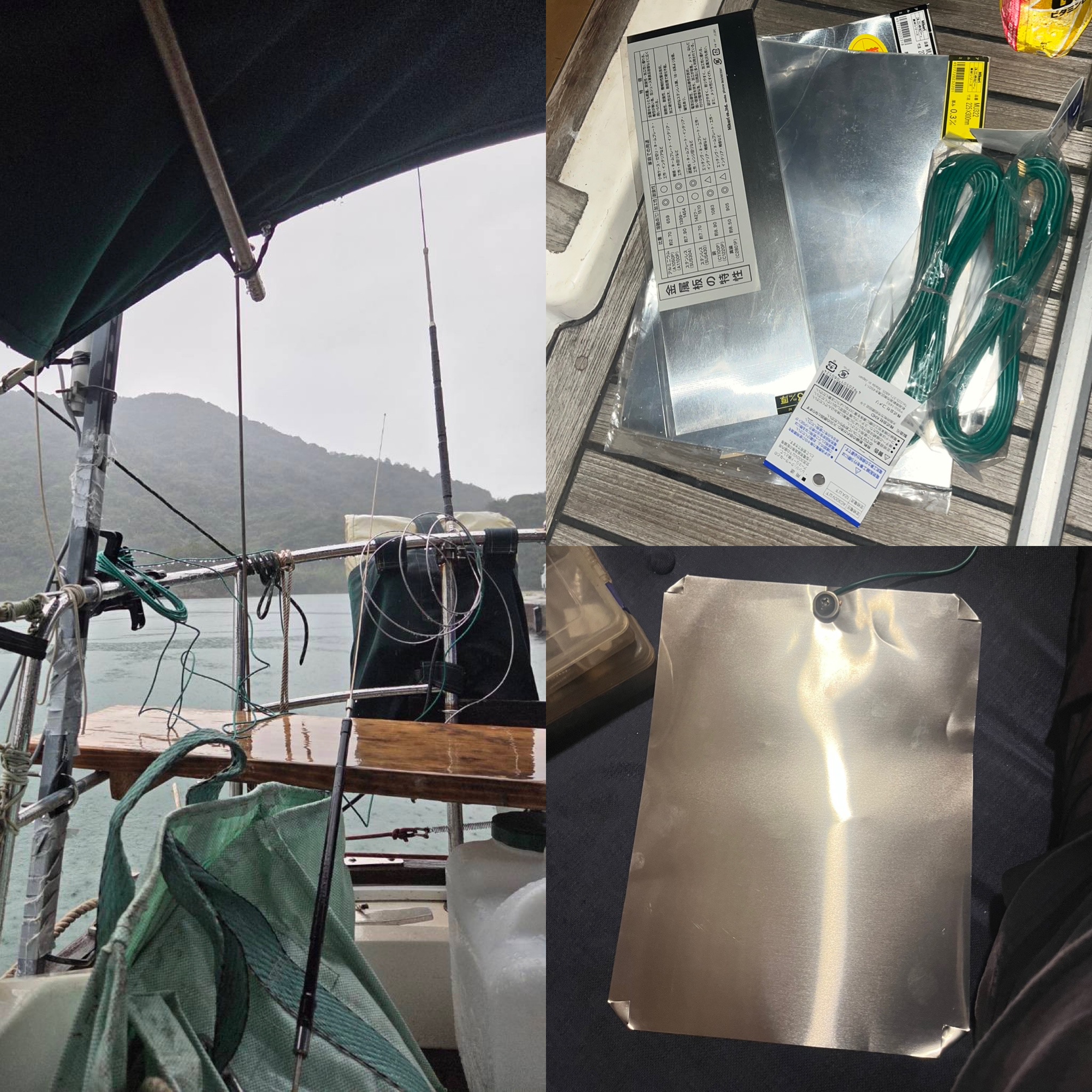 ただ、これですと停泊中しか送信でき無いのが残念なので、次は残りの10mのアース線を着けてアルミパネルは海中から出して、船の側面に這わせるように配線してみて、SWRが下がるようでしたら走りながらQRV出来るかな?と考えてますが、何か良いアイデアがございましたらご教示くださいませ。